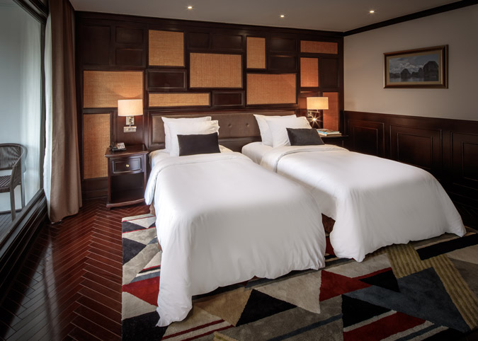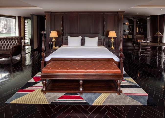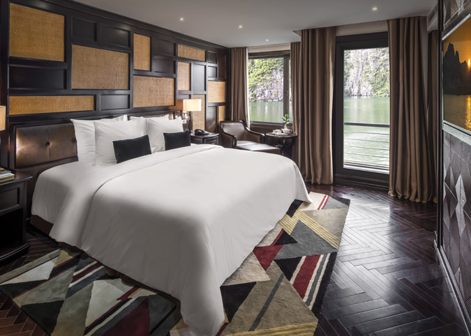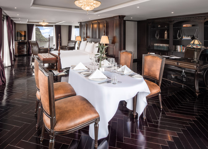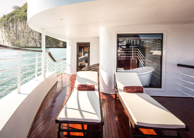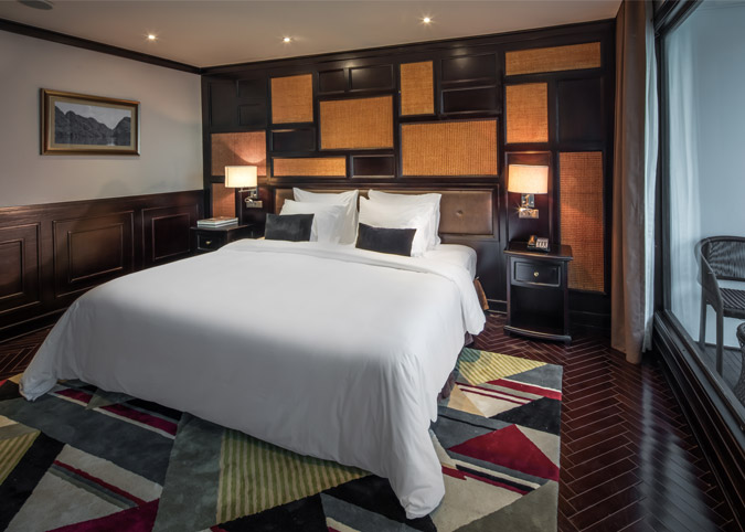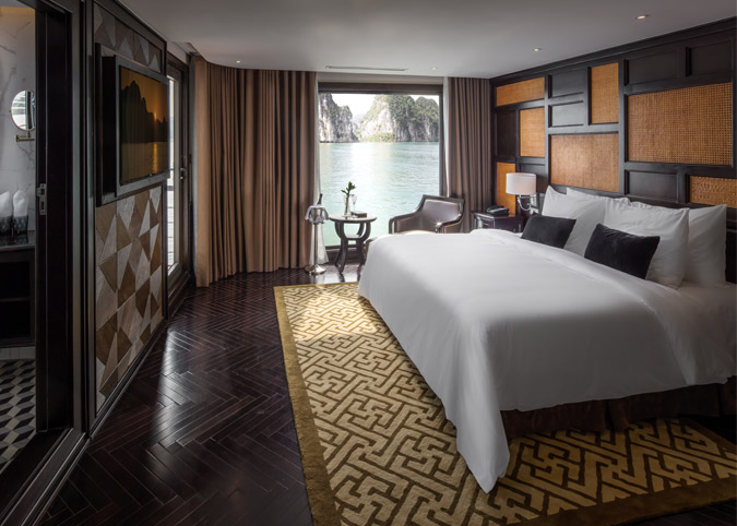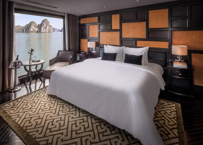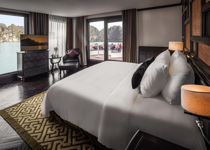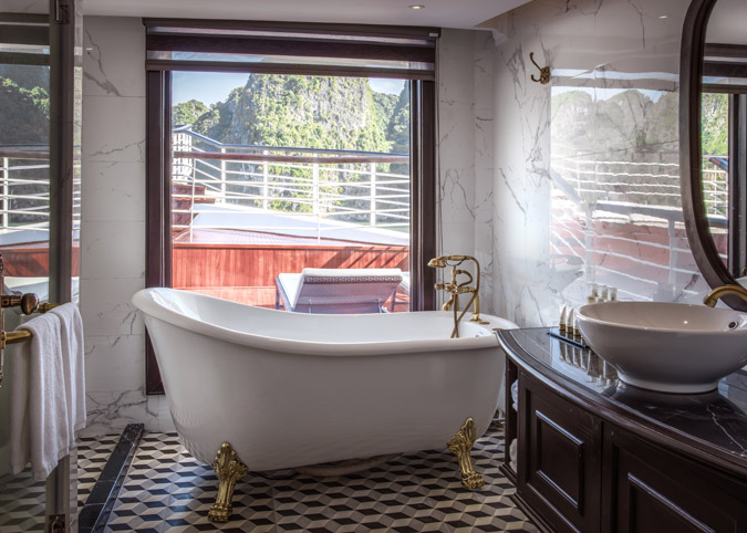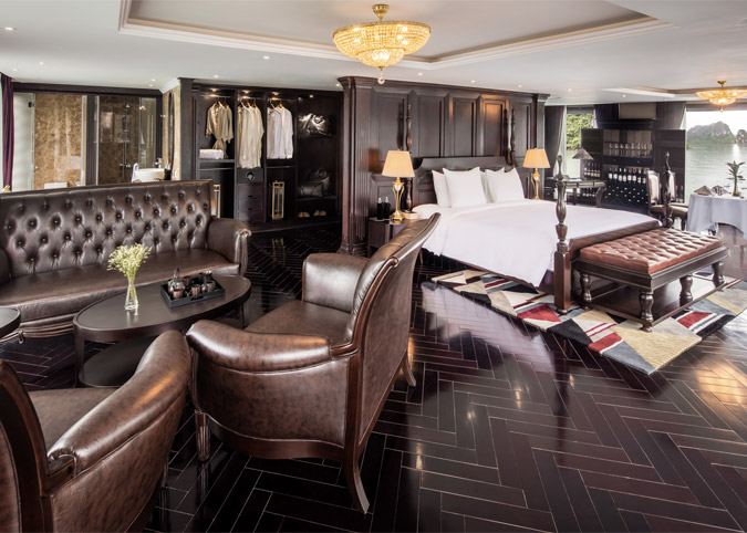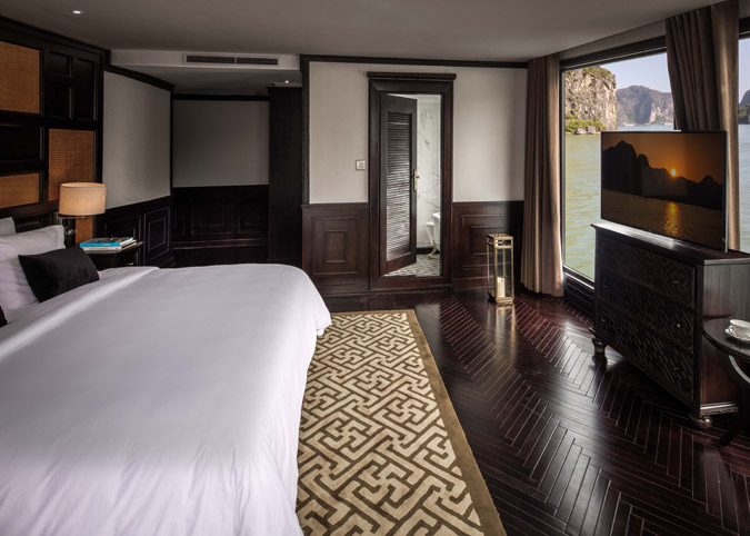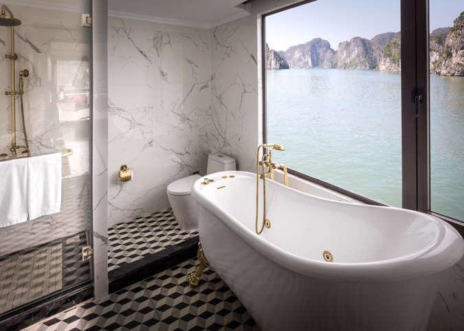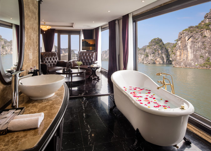 Imagine waking up to uninterrupted views of Halong Bay through a gigantic 180-degree window! The Ambassador Captain Suite isn't just a room, it's a luxurious haven on the second deck of the bow, designed to make your cruise unforgettable. We've thought of everything - a fully equipped room with luxurious touches, a comfy reading chair, and even a private bathroom with a window view. It's like having your own slice of paradise on the bay.
