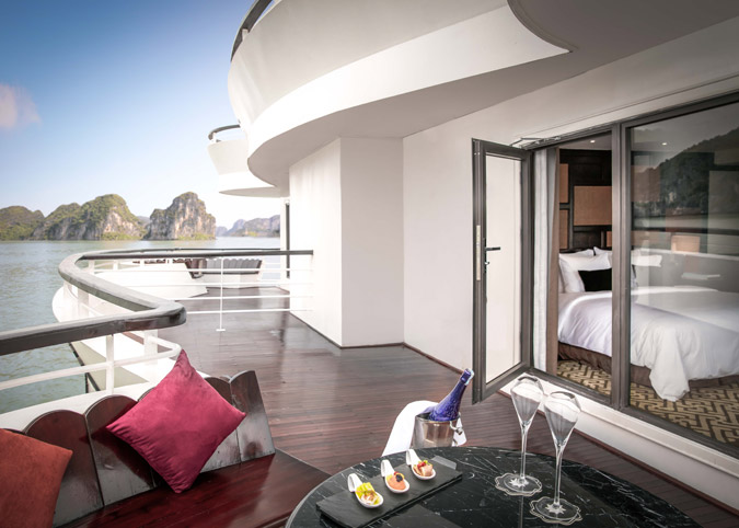 This luxury Halong Bay cruise features 5 decks, with 46 elegantly appointed cabins, all boasting private balconies or terraces for uninterrupted views of the stunning bay. Guests can indulge in a variety of onboard facilities, including a gourmet restaurant, a stylish piano lounge, two bars, expansive sundecks with a Jacuzzi, and a luxurious spa.