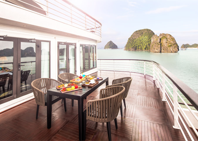 Ambassador Cruise sets itself apart with not just one, but two spacious 360-degree sundecks. Imagine basking in the warm sunshine or stargazing under a blanket of stars, all while enjoying breathtaking uninterrupted views of the bay's majestic landscape. These sundecks provide the perfect sanctuary for relaxation and reflection, allowing you to immerse yourself in the beauty of Halong Bay fully.