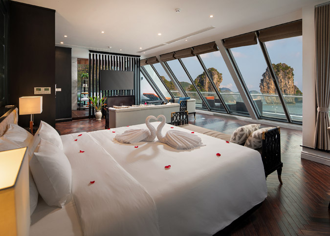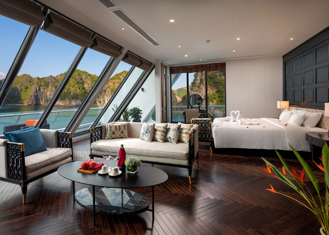 Awaken to the brilliance of Lan Ha Bay in our stunning Junior Suites. These havens reside on the first deck, boasting floor-to-ceiling crystal-clear windows that usher in the morning and afternoon sun. Step out onto an expansive private balcony and breathe in the fresh air, invigorated by the world heritage site's natural beauty.