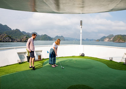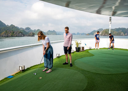 The golf course at Stellar of the Seas is one of the finest ones among Lan Ha Bay luxury cruises. Gear up for a unique golfing experience, featuring a driving range, a practice area with a putting green and bunker, and three challenging holes. Whether you're a seasoned golfer or a curious beginner, our onboard equipment ensures a fun and relaxing escape!
