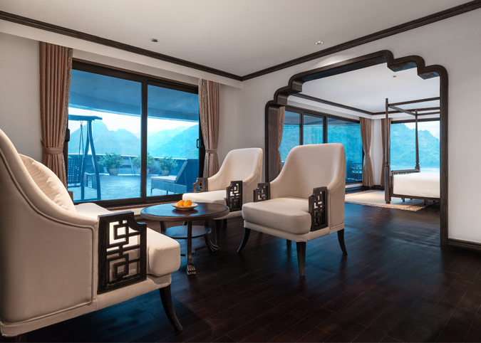 Covering 210 m2 of space, the Venus Presidence Suite is located on the top second deck with 01 guest room and 01 bedroom). This privilege suite has a 95 m2 interior, the crown jewel, and a 115 m2 terrace to capture the whole panoramic view of Lan Ha Bay. VIP treatment includes: personal butler service, private car transfers, a speedboat tour, and a personalized menu served in the suite or on the terrace,...