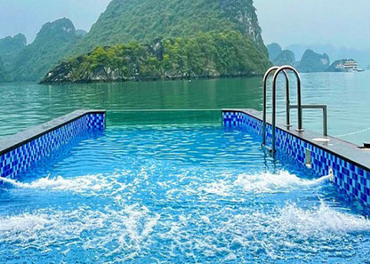 A popular spot for all ages - the Venus Cruise's stunning outdoor pool. Perched on the upper deck, this inviting oasis offers panoramic views of Lan Ha Bay's majestic landscapes. Unwind on plush loungers and soak up the sun, or sip on a cool beverage from the poolside bar. Perfect for families and couples alike, the open pool provides a delightful space to relax and reconnect after a day of exploring the bay's hidden wonders.